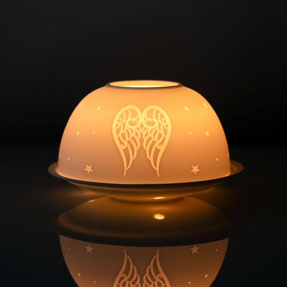 A beautiful white tealight holder with a ceramic dome and a delicate Angel wing design.Packaged Dimensions: H9.2cm x W14cm x D14cm