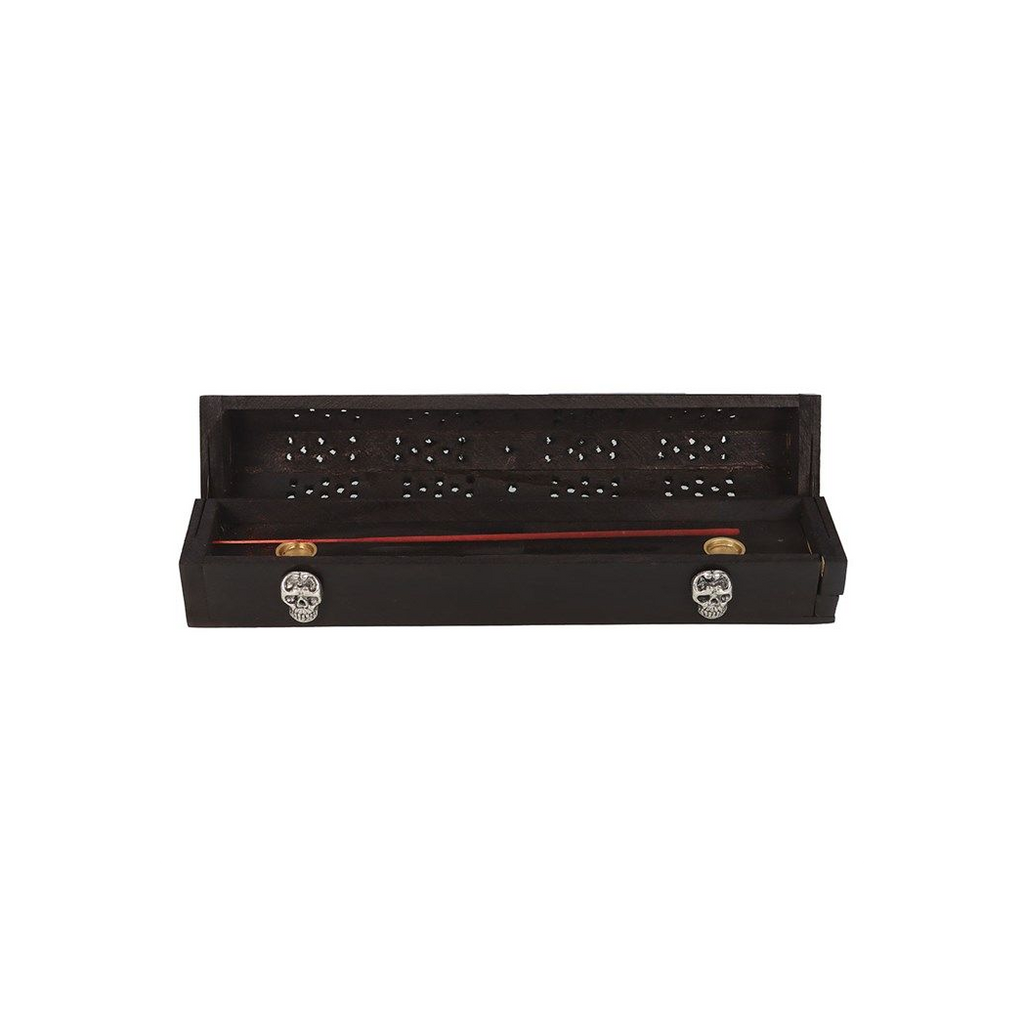 Ward off unwanted spirits with this Go Away Evil incense box set. Includes 10 rose-scented incense sticks, providing an uplifting floral fragrance for keeping demons at bay. Accented with silver skulls, the wooden box doubles as both an incense holder and storage. A perfect set for adding a touch of excitement to your favourite dark hideaway.