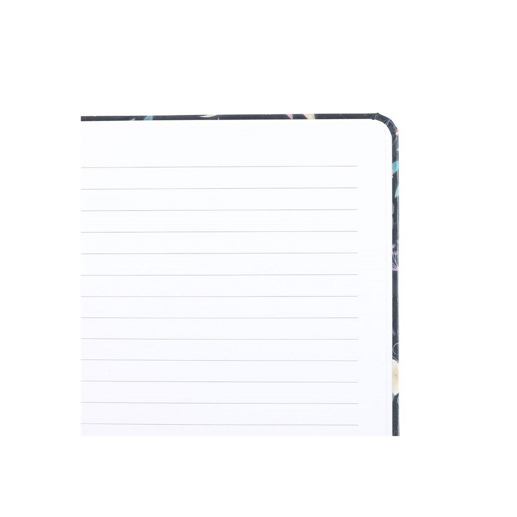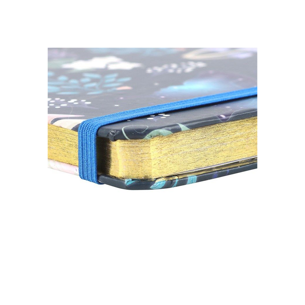 Whether used for notes, lists, or journaling, this beautiful A5 notebook will elevate your desktop with a mystical design of a flying night owl surrounded by midnight moths, crescent moons and forest plants. This notebook is accented by gold foil pages and a blue elasticated closure. Includes 100 sheets / 200 lined pages.