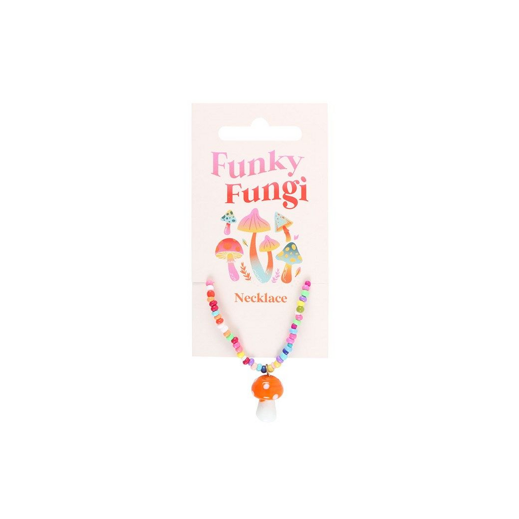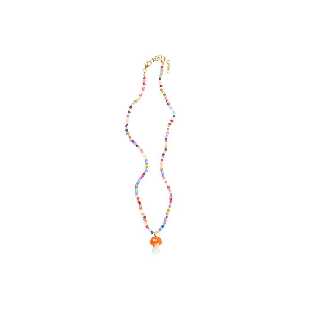 Add a touch of colour and joy to your jewellery collection with this glass toadstool mushroom beaded necklace. This delightful necklace features an intricately designed glass orange toadstool mushroom that hangs gracefully from a multi-colour beaded chain, and comes with a matching informational tag. A thoughtful gift idea for anyone who appreciates unique jewellery