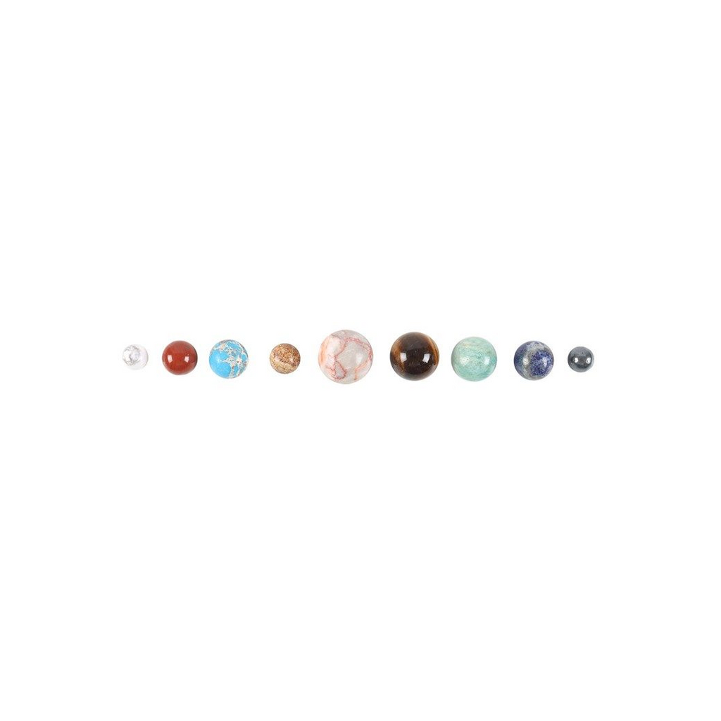 This gemstone sphere set features 9 gemstones that represent a planet from the solar system. Each gemstone is carefully selected and polished to resemble the size, colours and textures of the planets. Crystals in this set include howlite, red jasper, imperial jasper, picture jasper, red network jasper, tiger's eye, amazonite, lapis lazuli and hematite. Beautifully presented in a gift box with information about each planet's meaning inside. As each crystal is unique, stone shape and colour may vary from photos shown.